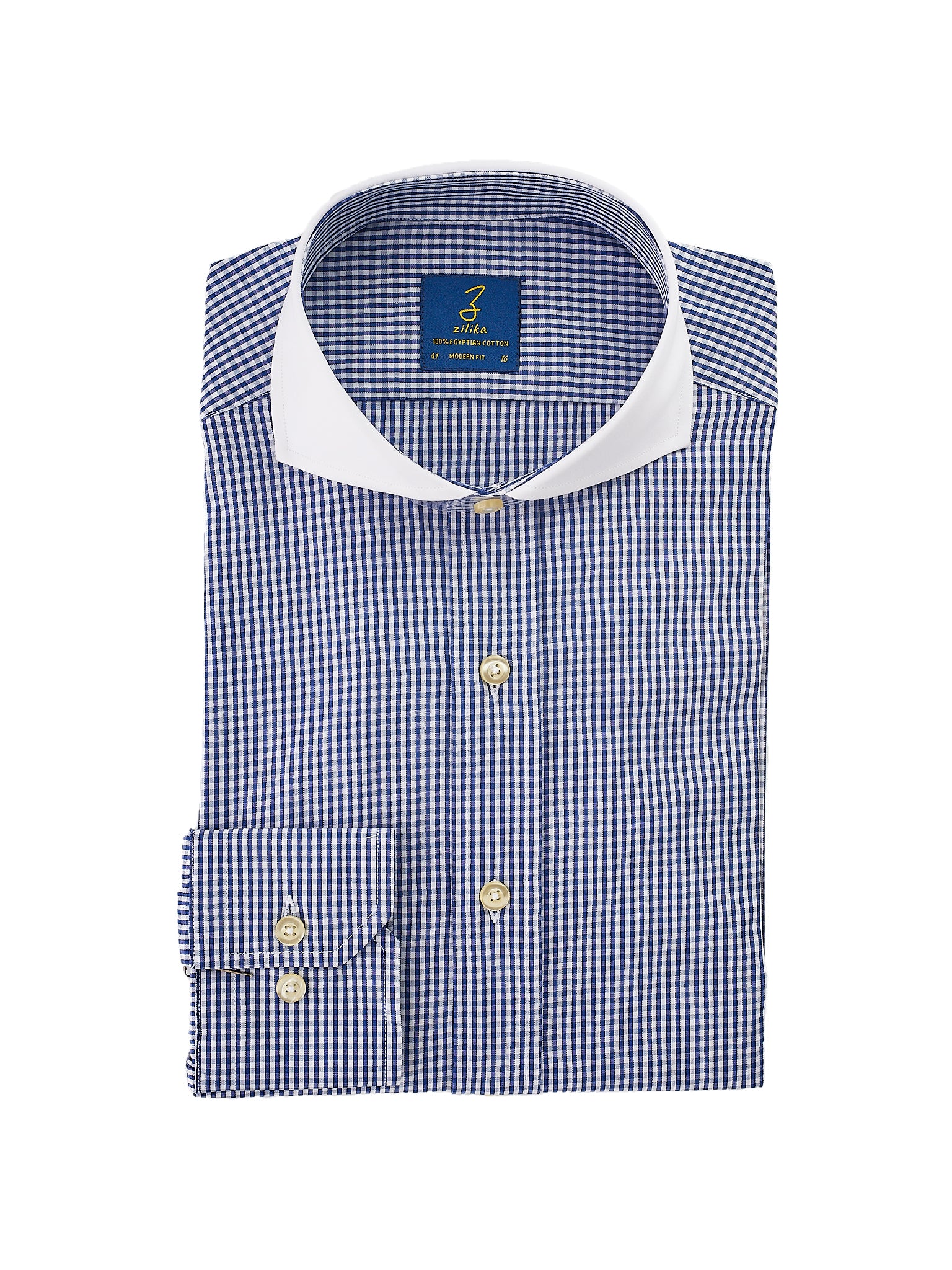 Verfijn je professionele garderobe met ons Bristol Overhemd voor Heren, met een donkerblauw geruit patroon en een opvallende witte cutaway-kraag. Gemaakt van 100% Egyptisch katoen poplin, biedt dit overhemd met lange mouwen ongeëvenaard comfort en een verfijnde look.
