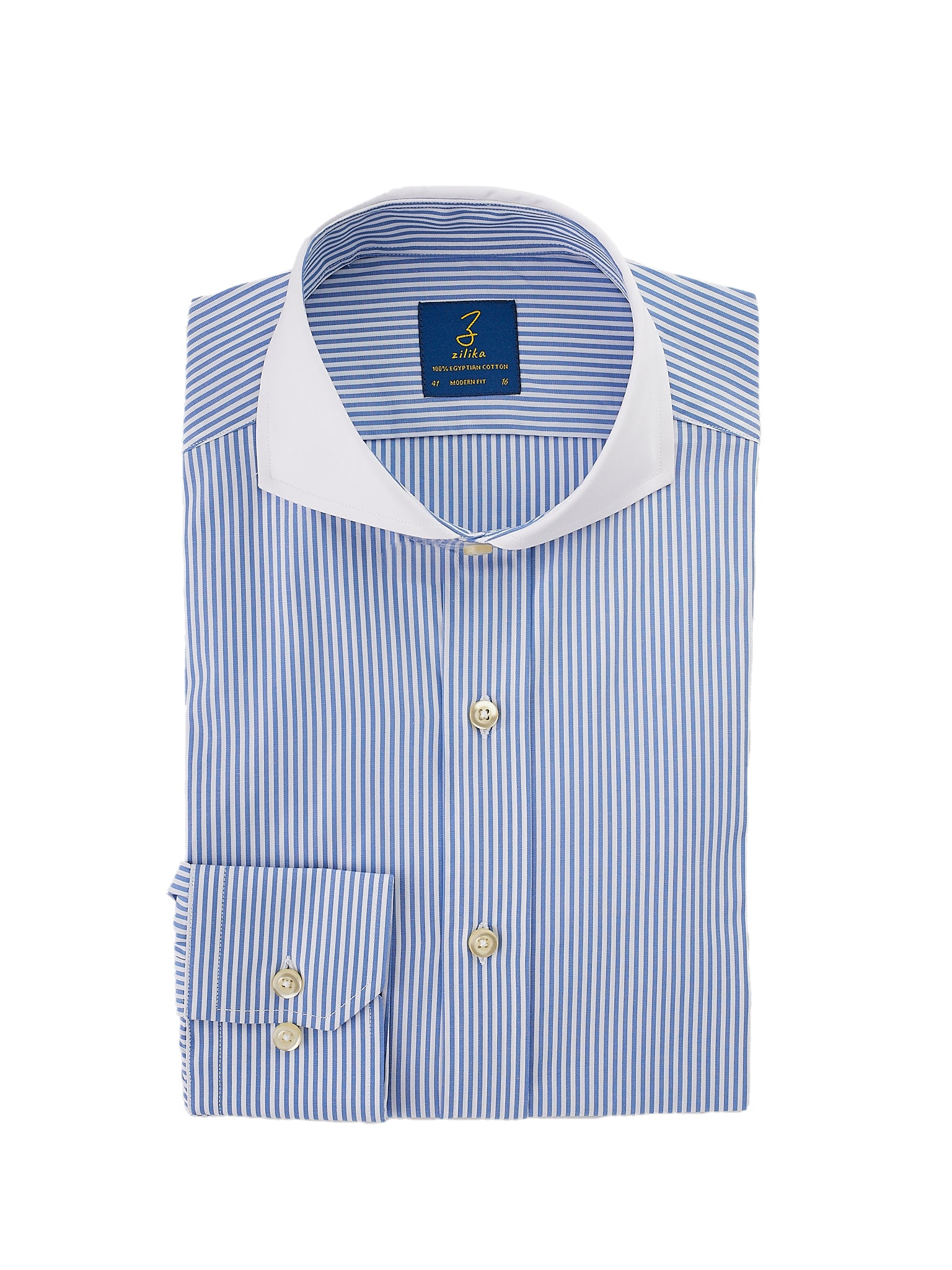Verfraai uw zakelijke kleding met ons Bristol-overhemd voor heren, met een lichtblauw gestreept ontwerp en een frisse witte cutaway-kraag. Gemaakt van 100% Egyptisch katoen, biedt dit overhemd met lange mouwen een combinatie van comfort en verfijning.